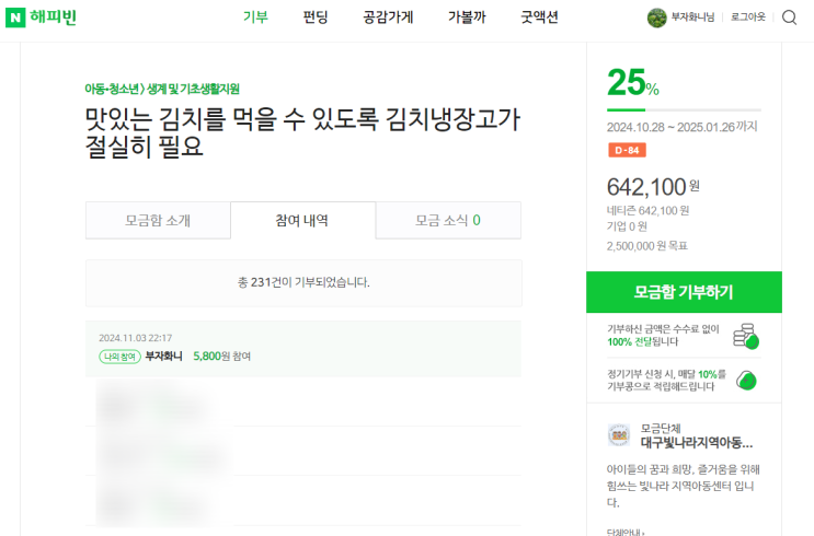 해피빈 10월분 기부. 맛있는 김치를 먹을 수 있도록 김치냉장고가 절실히 필요 (대구빛나라지역아동센터)