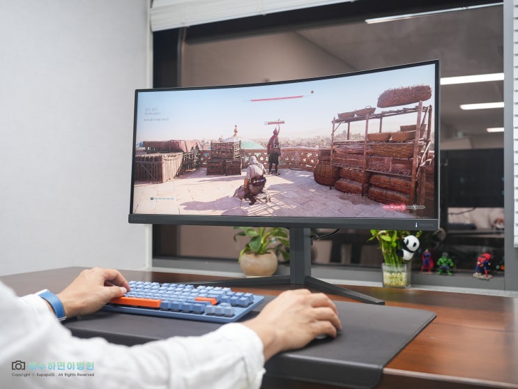 일반적인 게이밍 모니터와는 사뭇 다르다. 좌우로 길게 뻗은 울트라 와이드 모니터는 사용 목적이 분명하다...