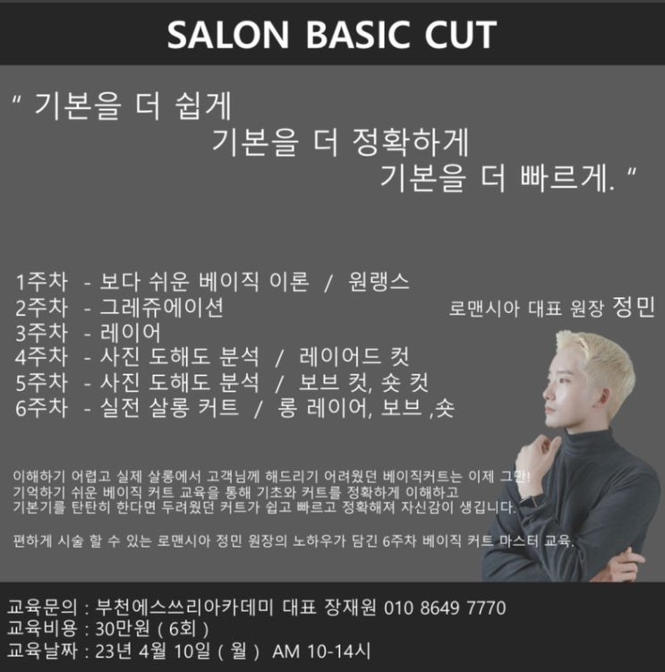숏 커트 교육 부천 S3아카데미 미용학원 누아헤어 허준 원장님의 특강입니다
