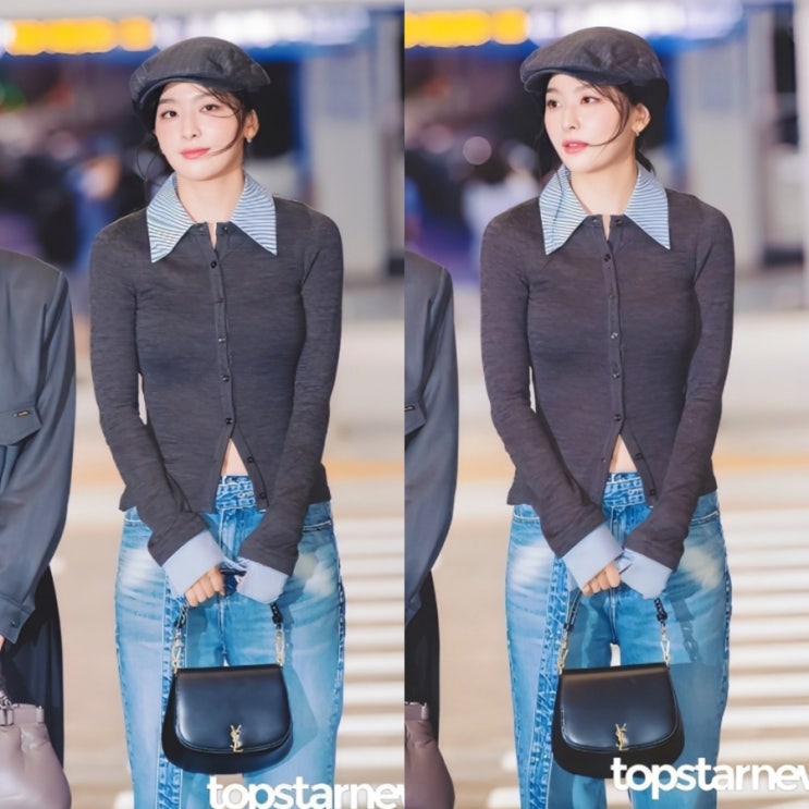슬기 공항패션 속 프렌치시크룩 제대로 보여준 헌팅캡 가디건 부츠컷 청바지 코디