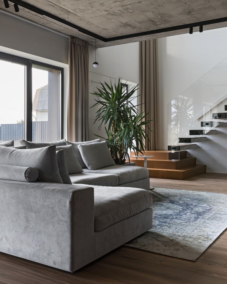 천장 인더스트리얼 모던 인테리어 노출 콘크리트 욕실 포스터 벽난로 현대적인 느낌의 노출 콘크리트와 중...