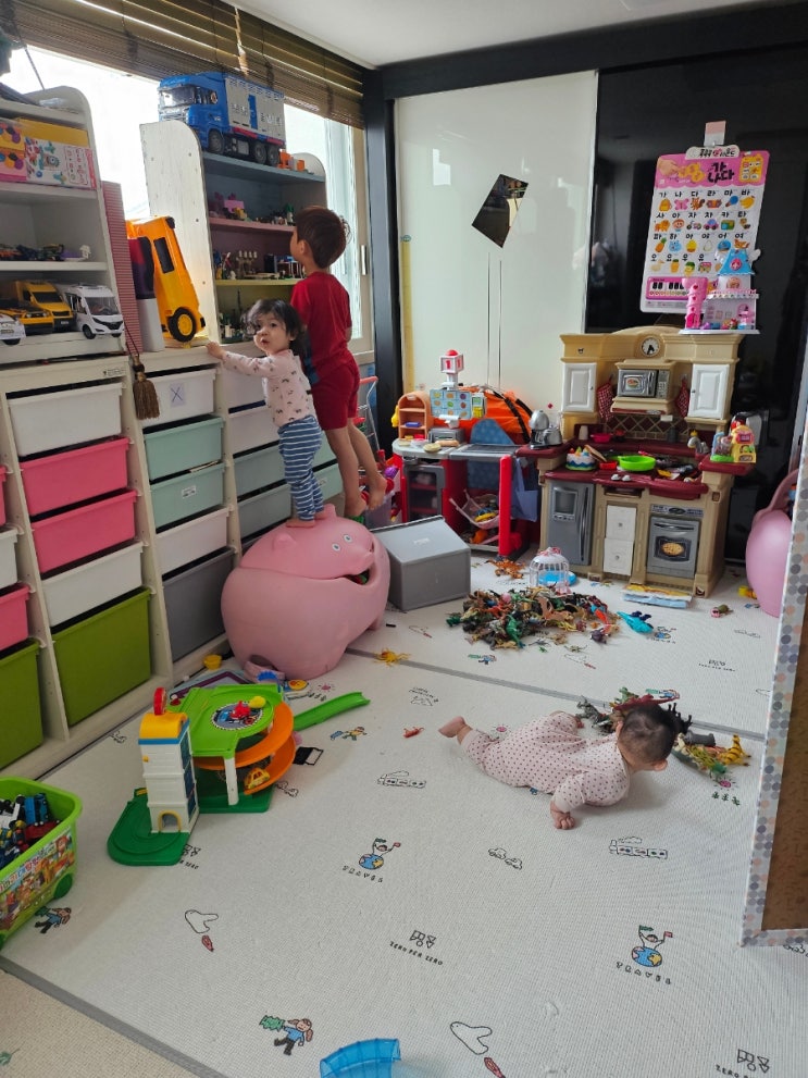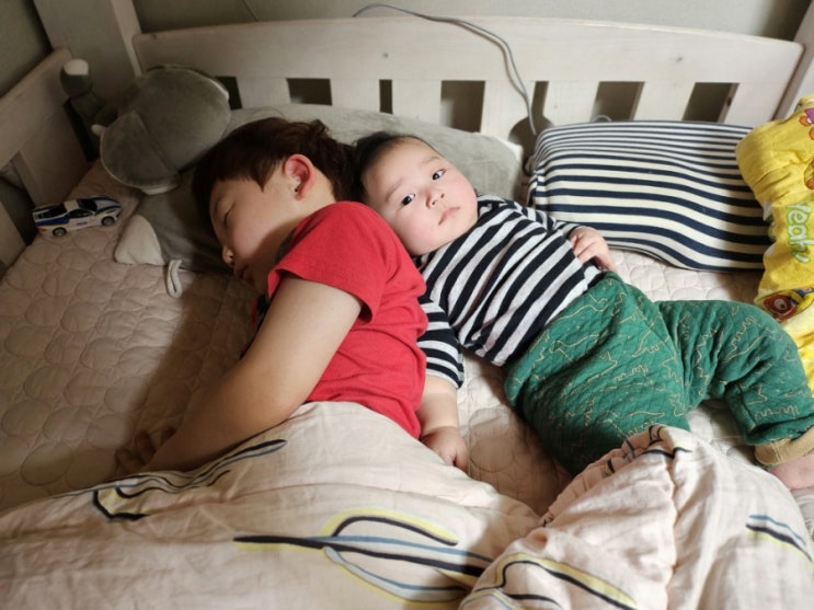 화요일이넹.... 둘째가 먼저 일어나서 패드하고 ㅋㅋㅋ 막내 기저귀 갈아주고 형아 옆에 눕혀주니 나름 편...