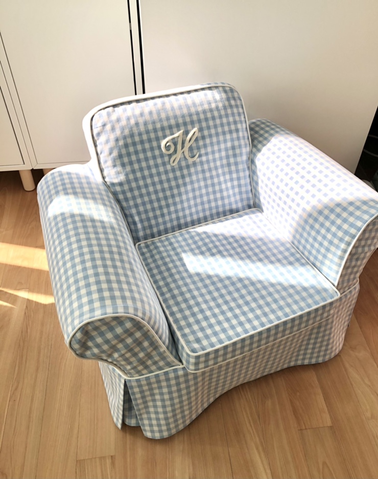 지난번 2인용에 이어 루키나1인용 소파에 씌운 베이지잔체크 커버입니다. 멀리서 보면 베이지 무지 ...