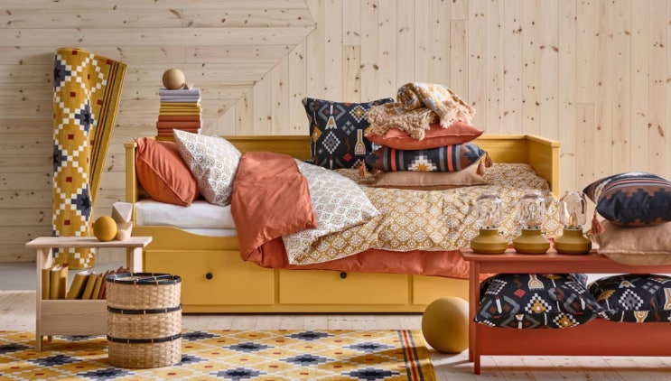 가을인테리어 신상품 이케아 추천템 노란 수납침대 주황 노트북스탠드 홈페이지에서 이 사진 보고 넘 예뻐...