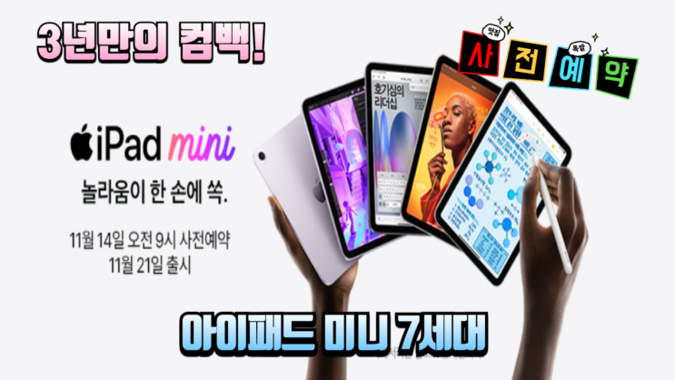 오늘은 드디어 3년 만에 새롭게 출시된 아이패드 미니 7세대를 소개해 드리려고 합니다. 이번 아이패드 미...
