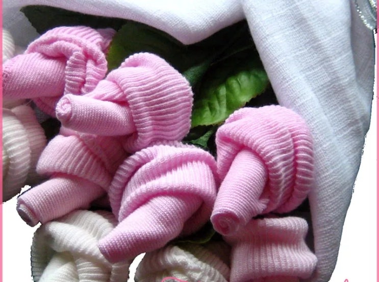 독특한 질감의 장미 꽃다발입니다. 소재를 보고 깜짝 놀랐습니다. 아기 양말로 만들었다고 하는군요. 아기 ...