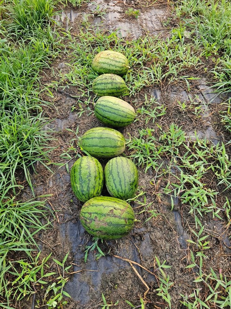 수박 수확시기를 놓친 것들이 있어서 뒤늦게 딴다. 이미 터진 것들도 있다. 아무리봐도 일반 수박이 아닌 ...