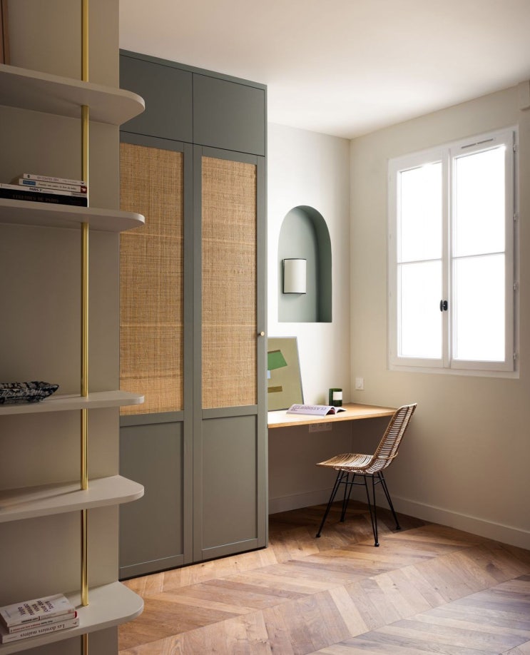작은 방 꾸미기 톤온톤 그린 라탄 인테리어 가구 의자 선반 책상 아늑하게 자연 소재로 아늑함을 더 한 작...