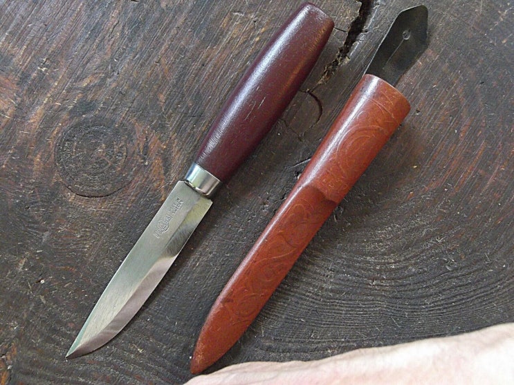기존의 모라 106에 딸려오는 플라스틱 칼집 대신 나무 깎는 칼 답게 나무로 칼집을 제작.. 보통 나무 칼집 ...