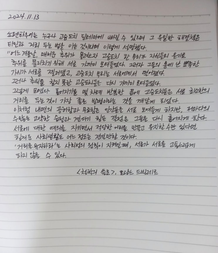쇼펜하우어는 누구나 고슴도치 딜레마에 빠질 수 있으며 그 유일한 해결책은 타인과 거리 두는 법을 아는 ...