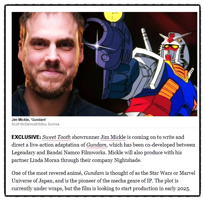 기동전사 건담 실사 영화가 2025년 초부터 제작 시작 발표 스위트 투스 쇼러너 짐 미클이 레전더리와 반다...