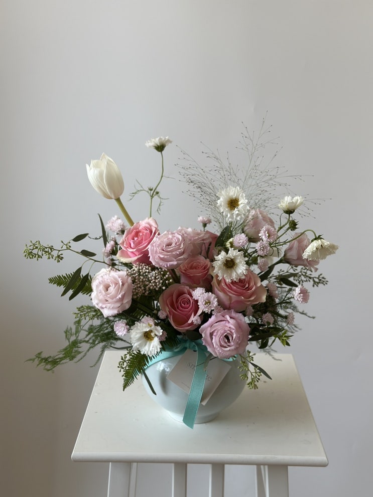 안녕하세요 ~ 오늘소개해드릴 디자인은 돌상 달항아리 센터피스 랍니다 내추럴하면서 카라와 코스모스가 들...