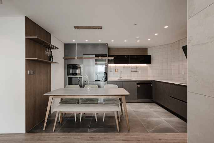 잠실 파크리오 아파트 33평 리모델링: 현관 중문, 자코모 4인용 가죽 쇼파, 원목 세라믹 식탁, 포세린 타일