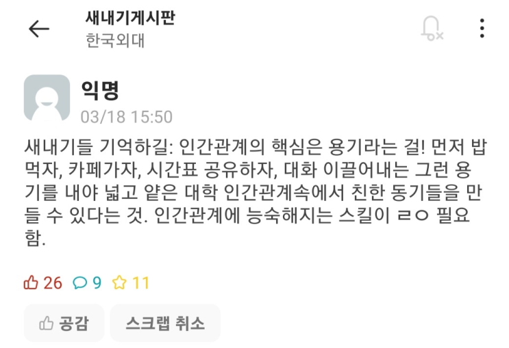 새벽에 에타 핫게시판 글을 보다가 반성하게 돼서 짧게 블로그에 글을 남긴다. 핫게시판에서 이 글을 보고 ...