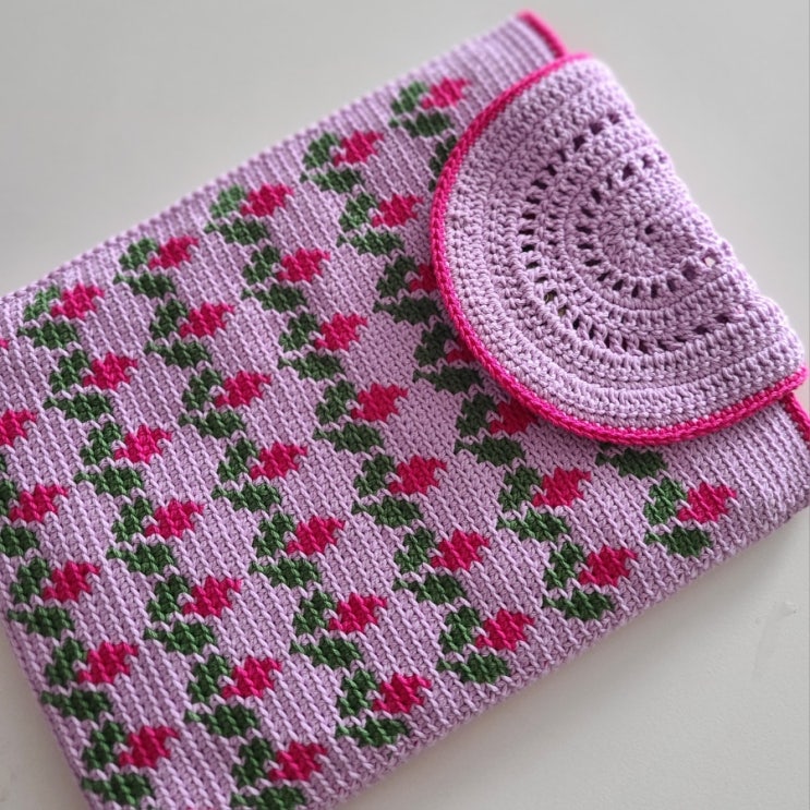 [코바늘 한땀한땀..76] 튤립 아이패드 파우치 크기 : 17*21cm 실 : 코스모스 면사 연퍼플, 체리핑크, 올리...