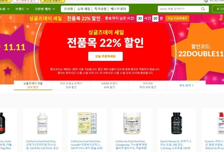 아이허브의 11월 프로모션은 그린프라이데이가 아닌;;;; 더블데이 22% 할인입니다. 11월 11일은 11이 두 번...