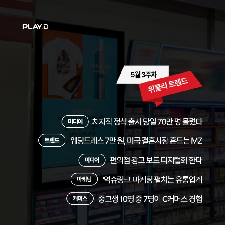 [플디트렌드] 5월 3주차 마케팅 트렌드 뉴스 | 치지직, 웨딩드레스, 편의점광고, 역슈링크, 중고생 C커머스