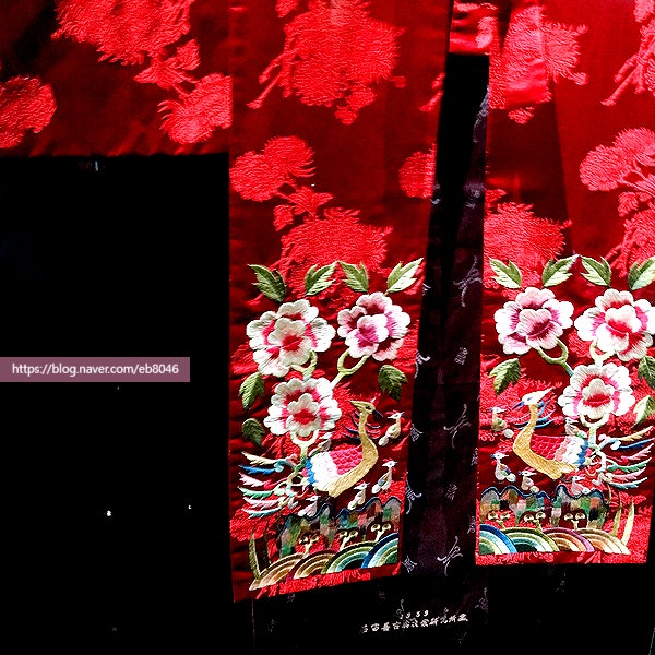 화려한 꽃 자수가 가득했던 활옷 전시. 결혼할 때 신부가 입었던 예복인 활옷. 붉은 바탕에 꽃, 동자, 봉황...