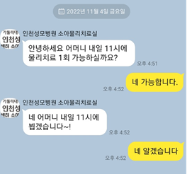 11월4일 인천성모병원 소아물리치료실에서 보강 문자가 왔고 당연히 빠른 답변으로 예약을 잡았습니다. 워...
