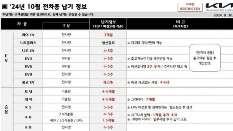 현기차 납기일정 현대차,기아,제네시스의 출고 대기기간 24년 10월 생산일정 계획표!