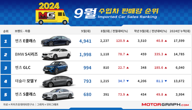 24년 9월 자동차 판매량 수입차 판매순위, 1위 탈환 벤츠!