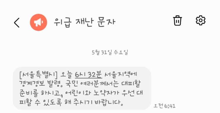 오늘 아침 위급재난문자 심장 터지는줄...