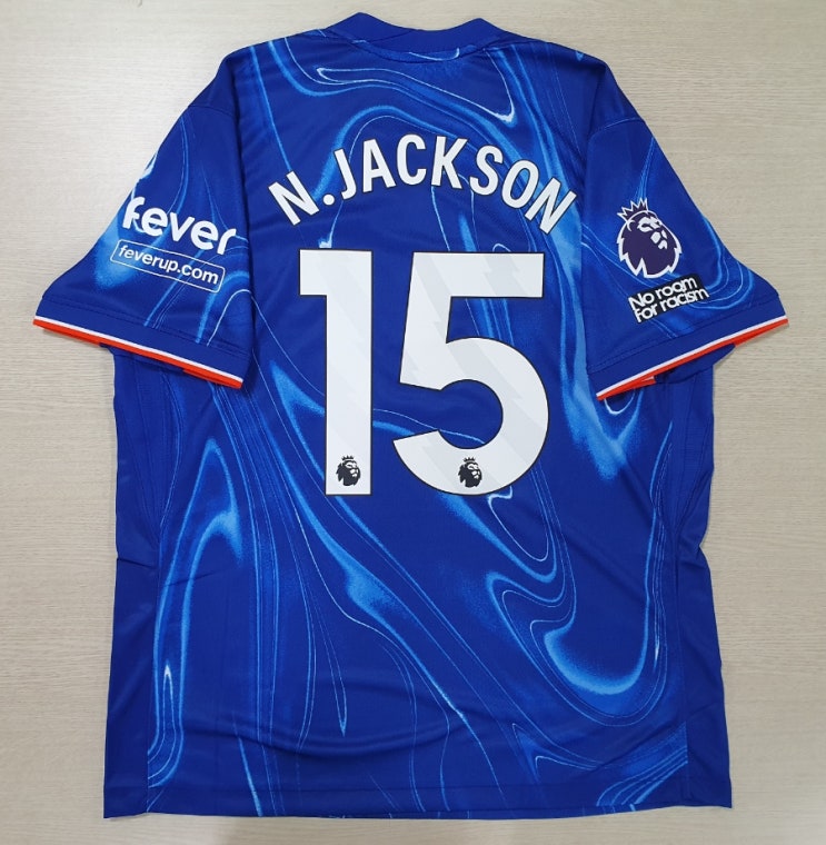 24-25 첼시 홈 유니폼 + M.JACKSON 15번 + 리그패치 + 인종차별반대패치 + fever 스폰서부착건//니콜라스 잭슨//홍반장의마킹실//축구마킹//축구유니폼마킹