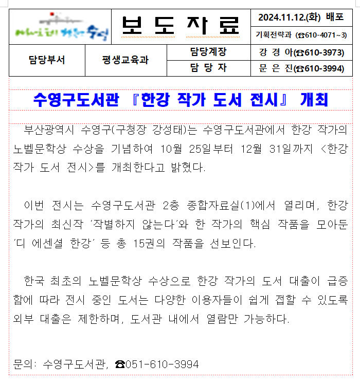 부산광역시 수영구(구청장 강성태)는 수영구도서관에서 한강 작가의 노벨문학상 수상을 기념하여 10월 25일...