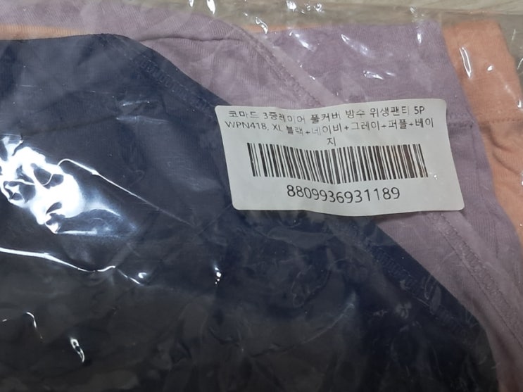 인터넷으로 구매한 방수 위생팬티 5가지색 블랙 네이비 그레이 퍼플 베이지 xl사이즈 5개에 12000원정도 (...