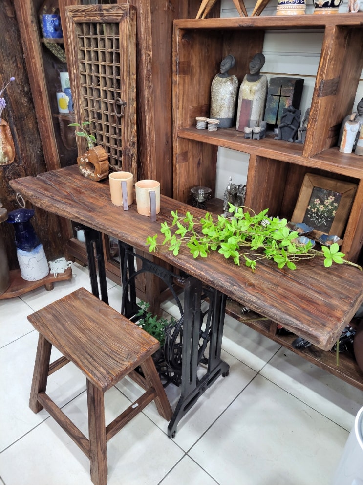 옛날 무쇠 재봉틀다리와 고재원목 상판이 만나 천생연분 인연이 되었습니다~ 찰떡 어울림입니다~♡ 뷰좋은 ...