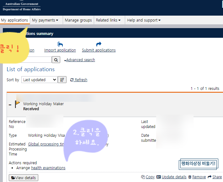 비자 신청상태를 확인한 you~ 자, 이제 헬스폼을 출력해보자. 다시 'My applications' 로 들어...