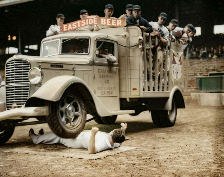 1935년 사람들을 가득 태운 트럭이 캘리포니아의 한 경기장에서 독재자 갈렌 고프(Galen Gough) 위를 지...