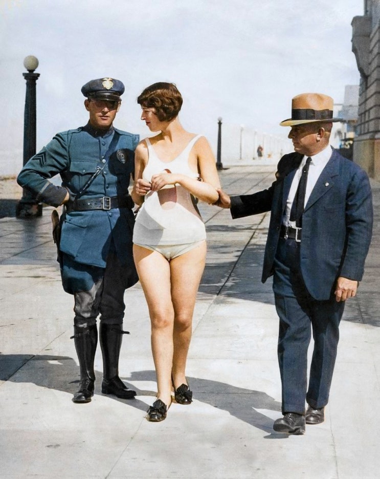 1920년 대 미국에서 노출이 심한 수영복을 입고 해변에 나타난 소녀가 체포된 모습이다. 1920년대 프랑스와...