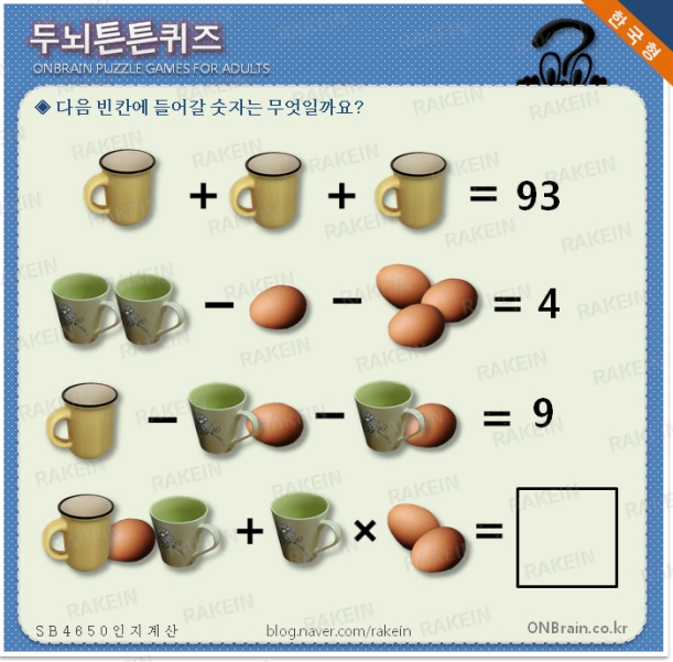 두뇌튼튼퀴즈- 10월 30일 B4650번 머그컵 녹색머그컵 달걀 노란머그컵 계란 ONBrain Cognitive Learn...