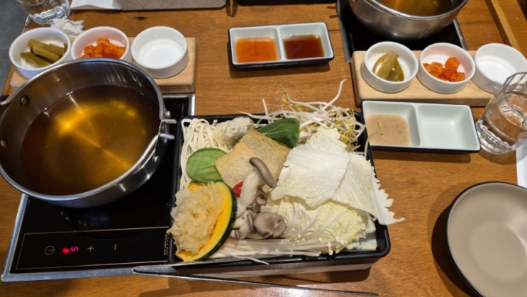 둔산동 갤러리아 타임월드 바로 뒤에 있는 솔밭샤브에 갔다. 일인식탁이라고 써있는데 두 명도 마주보고 앉...