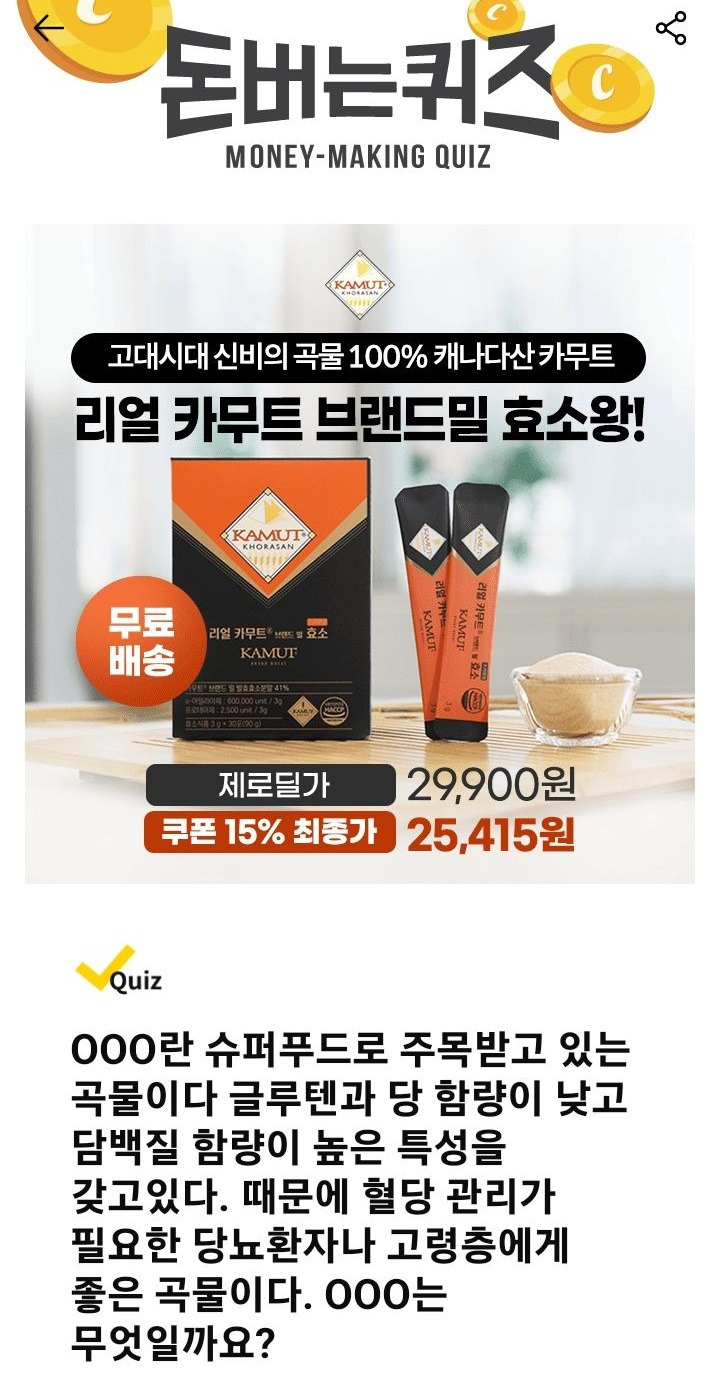 ▣ Quiz 000란 슈퍼푸드로 주목받고 있는 곡물이다 글루텐과 당 함량이 낮고 담백질 함량이 높은 특성을 갖고있다. 때문에 혈당 관리가 필요한 당뇨환자나 고령층에게 좋은 곡물이다. 000는 무엇