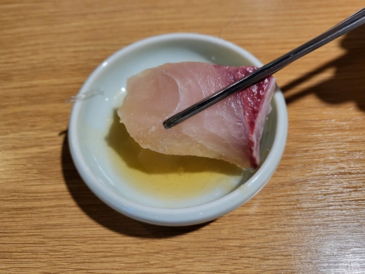 을지로대방어 미진일식에서 기름장에 찍은 대방어