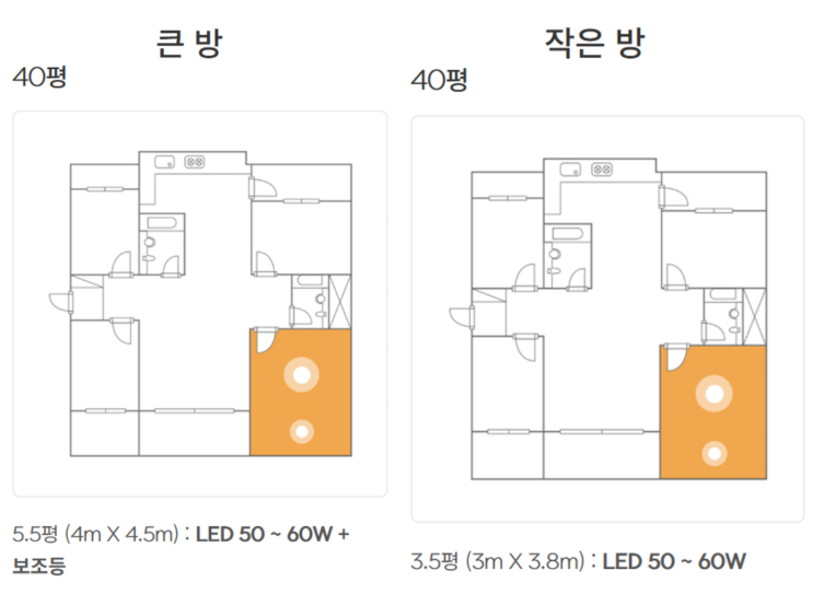40평대 아파트 LED 방등 안방 작은방 조명 밝기 W 와트 조도 추천
