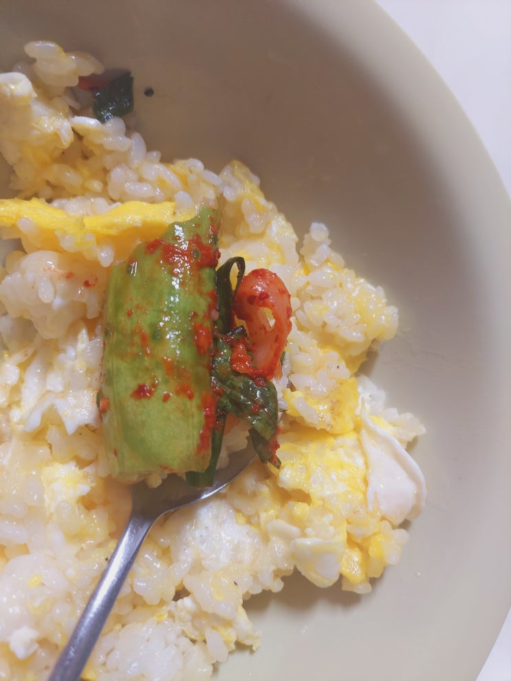 아침을 잘 먹지 않던 아들과 딸들의 침을 챙겨주려 계란 볶음밥에 김치나 오이소박이를 올려주어 교복을 입...