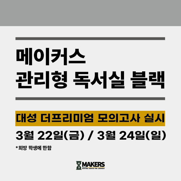 대치동 한티역 메이커스 관리형 독서실! 3월 22일(금), 3월 24일(일) 대성 더프리미엄 모의고사 실시