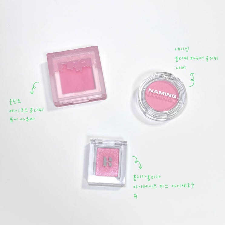 비교 발색 | 베리 핑크 좋아하는 사람 여기 모여라~!, 글린트 베이크드 블러쉬 퓨어 사쿠라 / 홀리카홀리카 마이페이브 피스 아이섀도우 츄 / 네이밍 플러피 파우더 블러쉬 니제