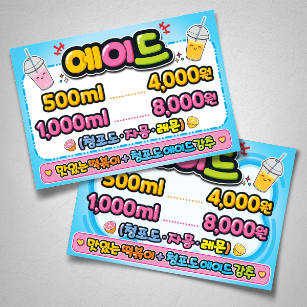 시원한에이드와 어울리는 디자인으로 맛있는분식집 메뉴판 제작