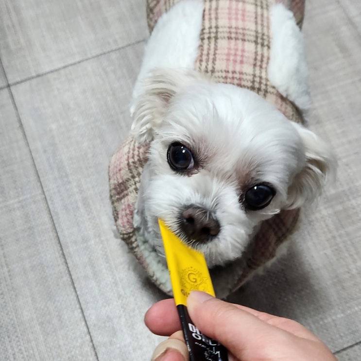 이번에는 정관장 지니펫에서 강아지사료와 강아지간식으로 강아지 홍삼 황태 츄르를 띵똥이에게 급여해 본 ...