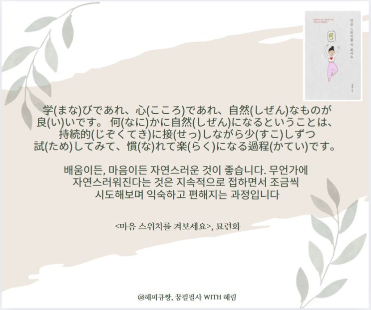 배움이든, 마음이든 자연스러운 것이 좋습니다. 무언가에 자연스러워진다는 것은 지속적으로 접하면서 조금...