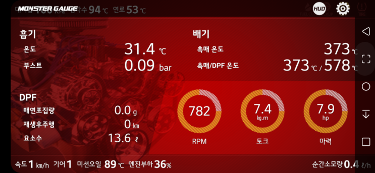 주차장 도착과 함께 포집량 0.0g 재생거리 345Km. DPF온도가 200대로 떨어질 때까지 잠시 대기. 현재 5...
