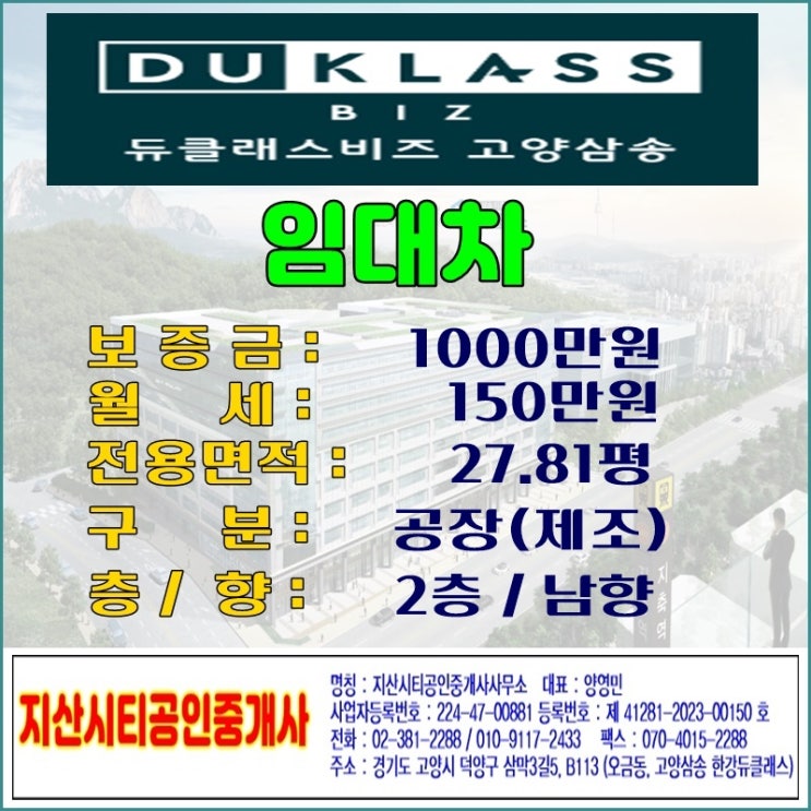 고양삼송 한강듀클래스 지식산업센터 임대차 매물 정보