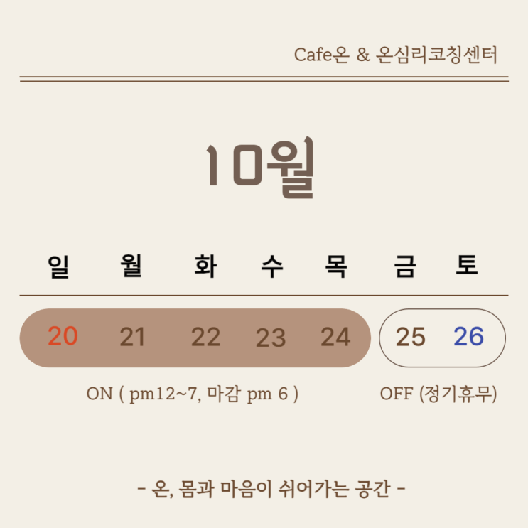 - Cafe온, 주간 오픈 일정 - 공주카페온 (2024. 10.20 ~ 10.26) ■ 주간 오픈일정 · ON / 매주 일~목 (p...