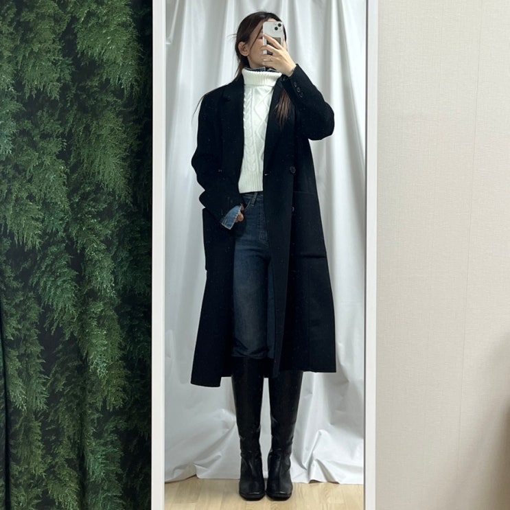 겨울 청청코디 (스튜디오 톰보이 코트, 샵사이다 니트 베스트, 청남방, 부츠컷 데님 팬츠, 사뿐 롱부츠)