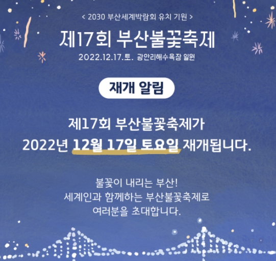 2022년 취소되었던 부산 불꽃축제가 다시 열립니다. 12월 17일 토요일 광안리 해수욕장에서 다시 개최가 되...