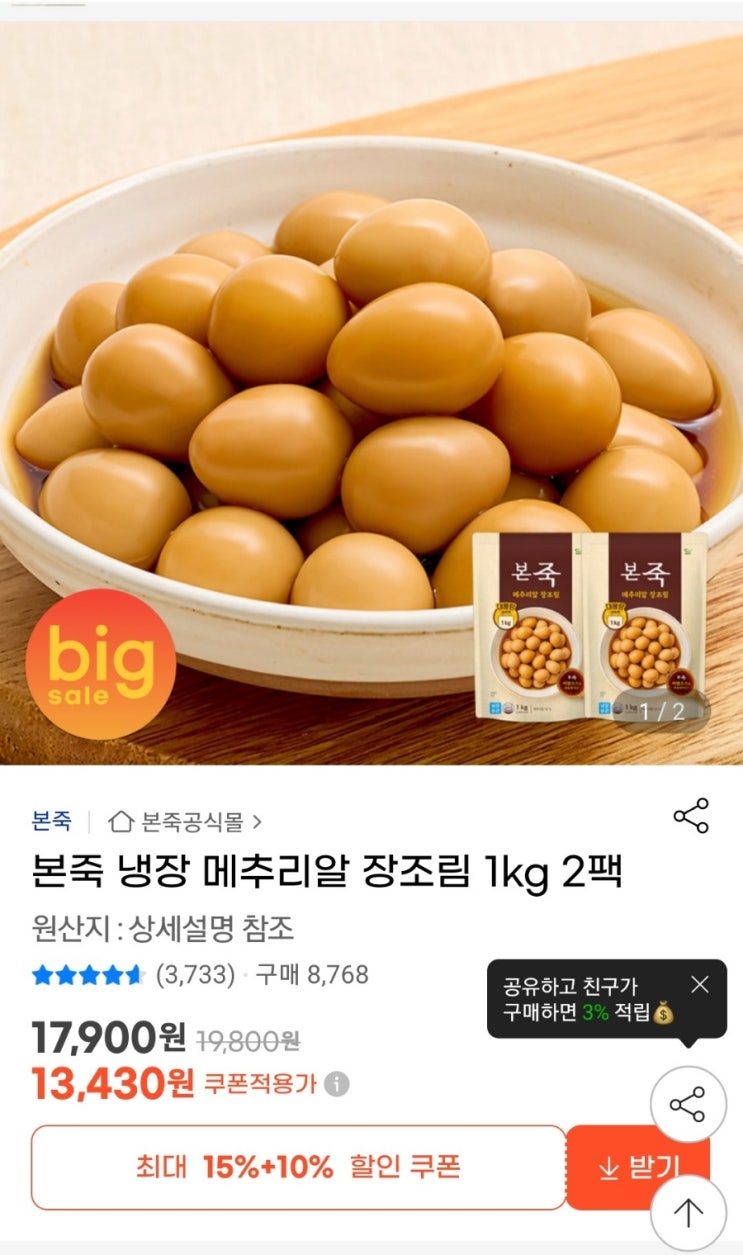 할인정보 G마켓 본죽 메추리알 장조림2kg 13,430원 무배 #할인정보 #앱테크 #핫딜 #식비방어 #이벤트 #짠...